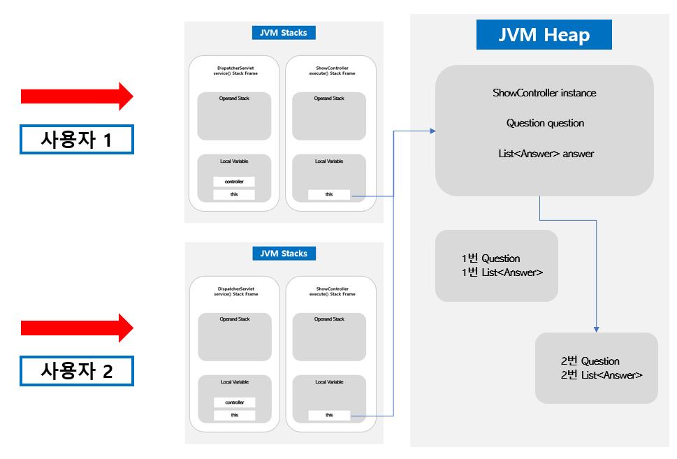 ShowController는 인스턴스 하나를 여러 개의 쓰레드가 공유하고 있다. 위와 같은 코드가 메모리에서 어떻게 동작하는지 생각해보자.