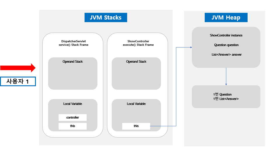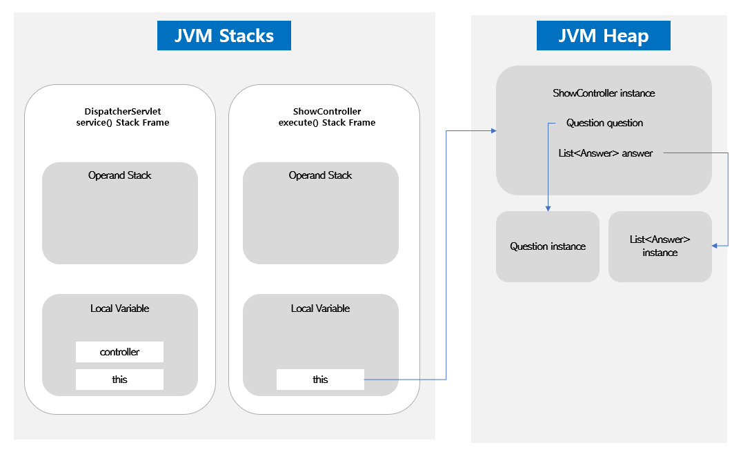 ShowController에 대한 인스턴스는 힙에 생성되어 있으며, ShowController 필드에 Question과 List<answer>를 가지기 때문에 힙에 생성되어 있는 Question과 List<Answer> 인스턴스를 가르키는 구조로 실행된다.
