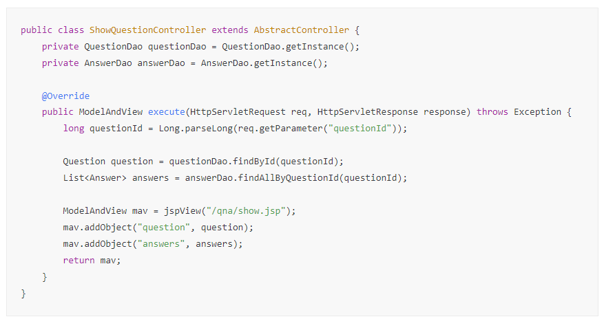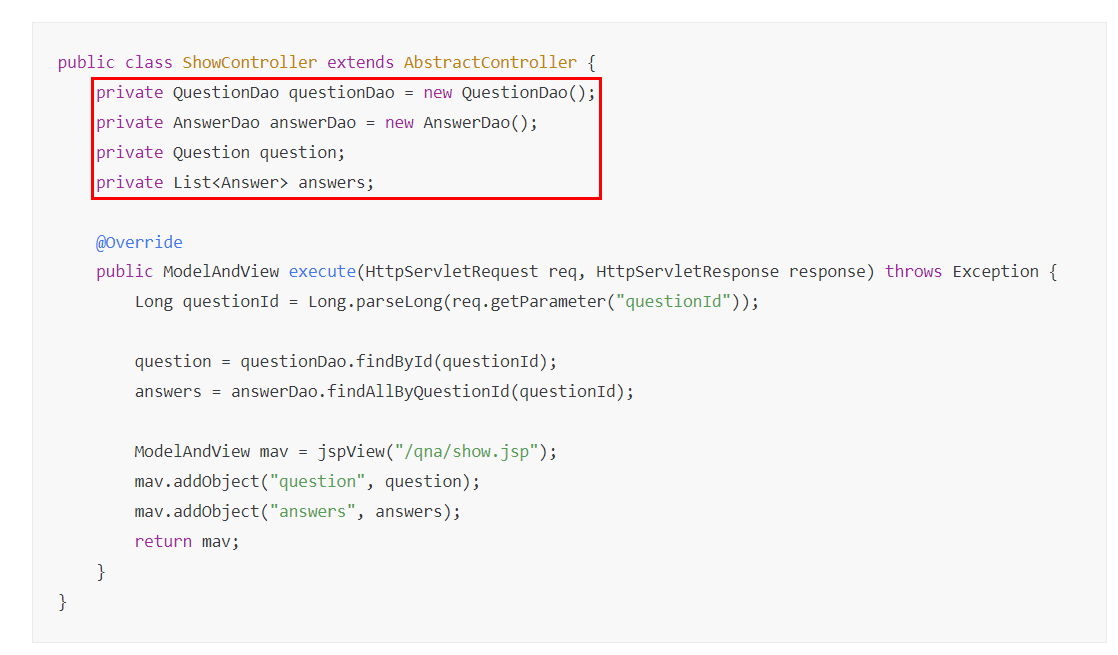 위와 같이 execute() 메서드의 로컬 변수로 구현하면 ShowController가 Question과 List<Answer> 인스턴스에 대한 참조를 가지지 않고 ShowController execute() 메서드의 스택 프레임의 로컬 변수 영역에서 인스턴스에 대한 참조를 가진다.