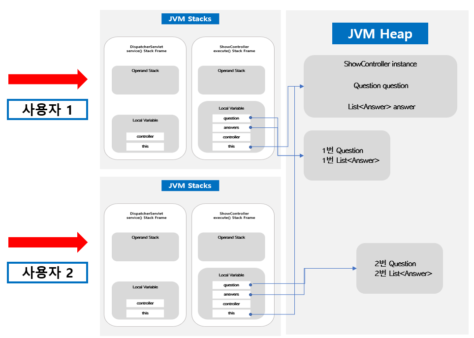 두 번째 쓰레드가 실행되면서 ShowController가 가르키는 Question과 List<Answer>가 1번이 아닌 2번으로 바뀌었다. 두 번째 쓰레드는 정상적으로 2번 글에 대한 질문과 답변을 응답으로 받는다. 하지만 첫 번쨰 쓰레드는 1번 글을 보기 위한 요청을 보냈고, 2번 글에 대한 질문과 답변을 응답으로 받게된다.