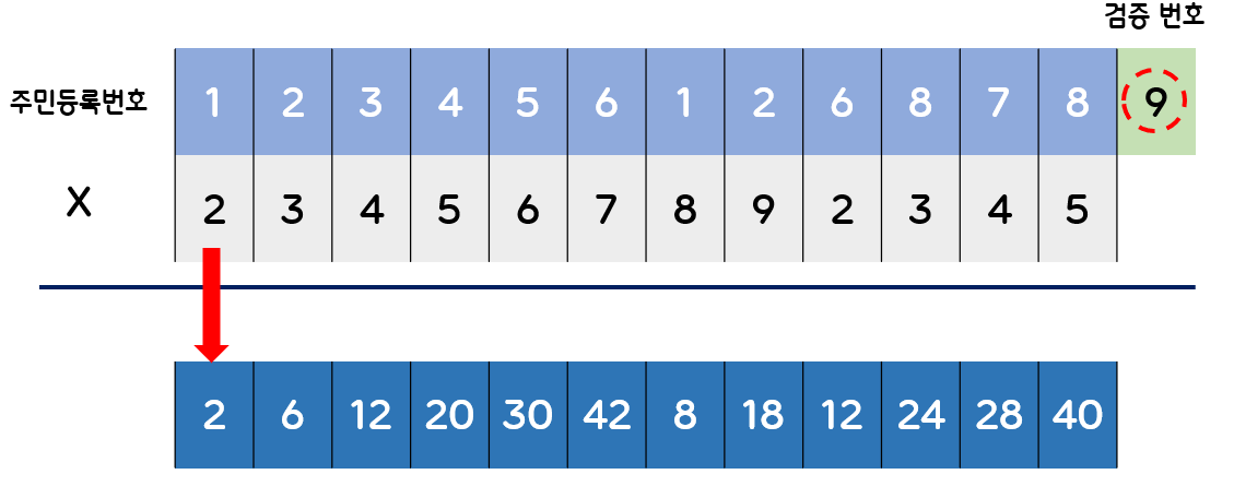주민등록번호 중 맨 마지막 번호를 제외하고 정해진 값들을 곱한다.