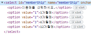 이를 브라우저를 통해서 보면, option의 value 속성에는 회원권의 고유 식별번호가 포함되어 있습니다.